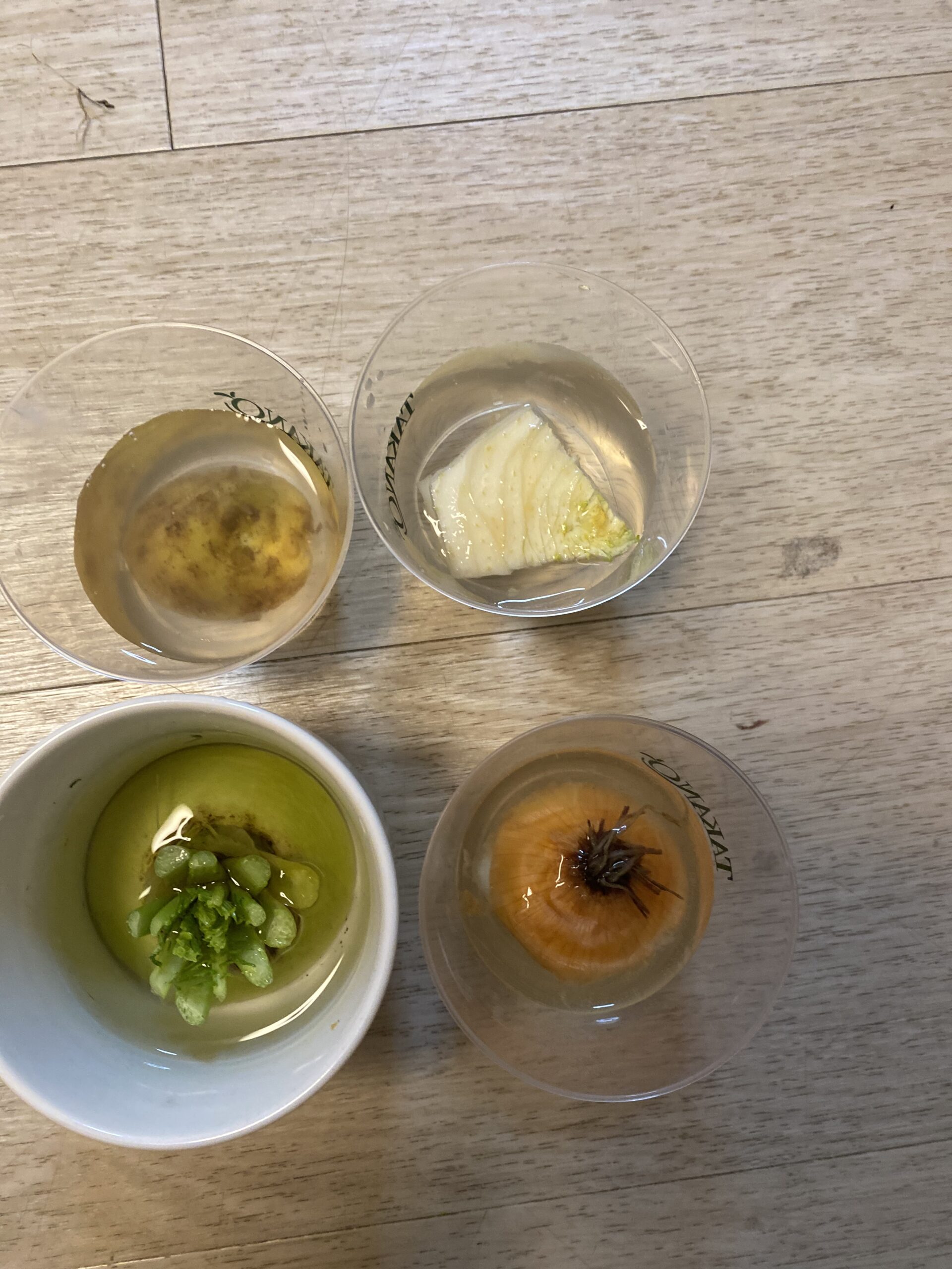 にっき きれはし こんばんは松ぼっくりです。おととい白菜と、玉ねぎと、じゃがいも🥔だいこんのきれはしをそだててます。じゃかいもはしずんでだいこんはおおいいからうかぶにみえるし、はくさいはうかんでるしたまねぎはうかんでます。今日幼稚園に、おにがきて、おにはそと... 2022.02.03 にっき